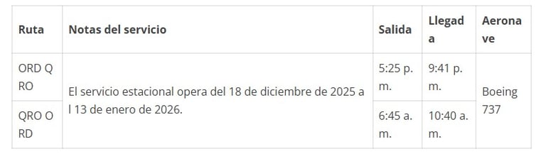 American Airlines ha lanzado una nueva ruta estacional desde el Aeropuerto Internacional O’Hare de Chicago (ORD) al Aeropuerto Internacional de Querétaro (QRO), que operará durante la temporada alta de vacaciones, desde el 19 de diciembre de 2025 hasta el 13 de enero de 2026.